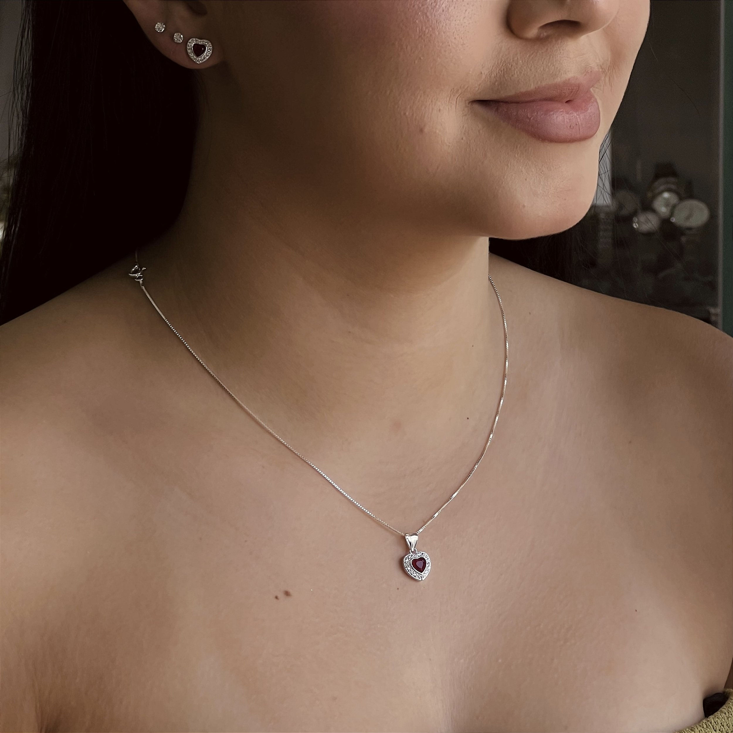 Conjunto Coração Vermelho Cravejado Prata 925 - CJPR123